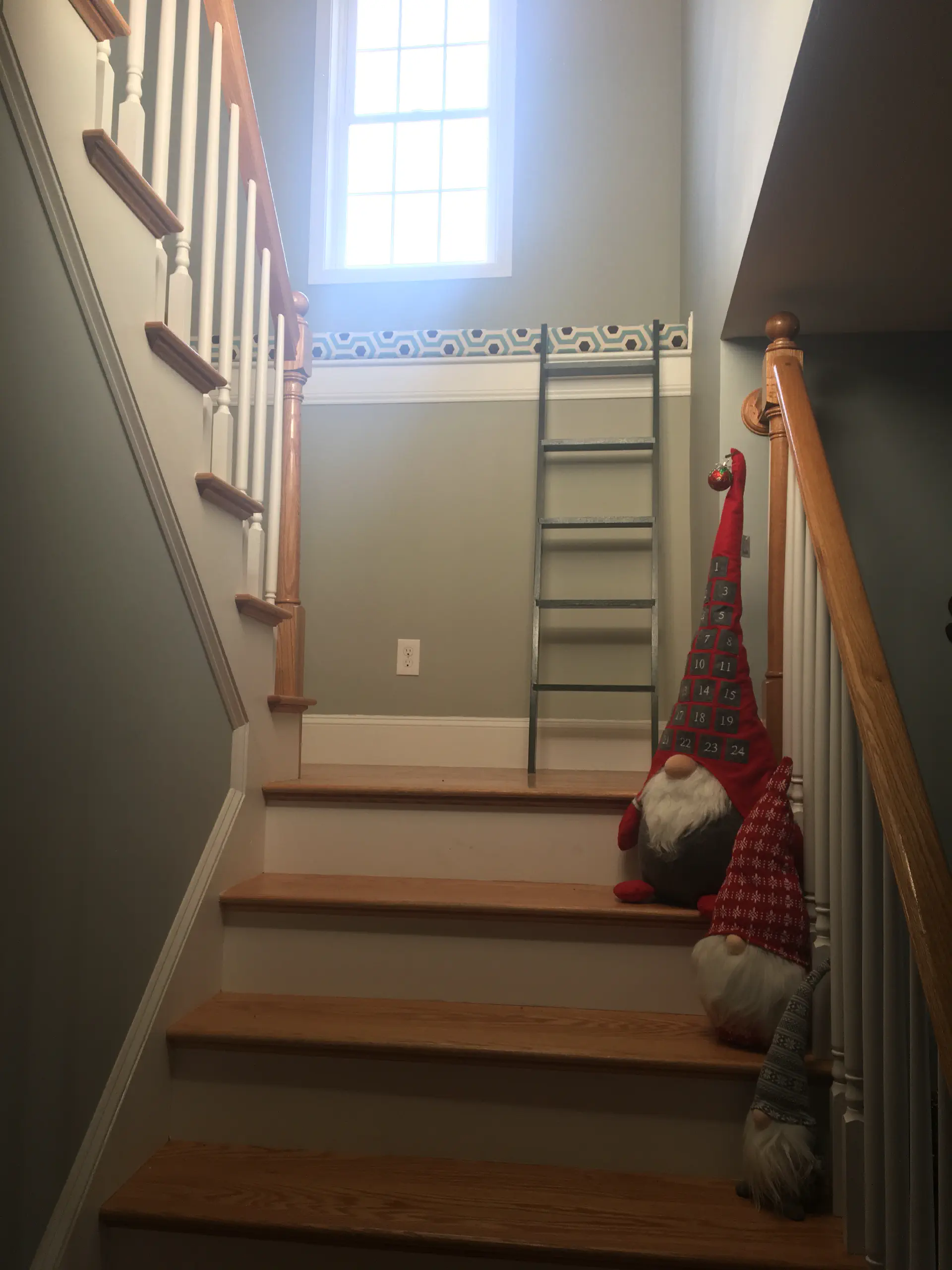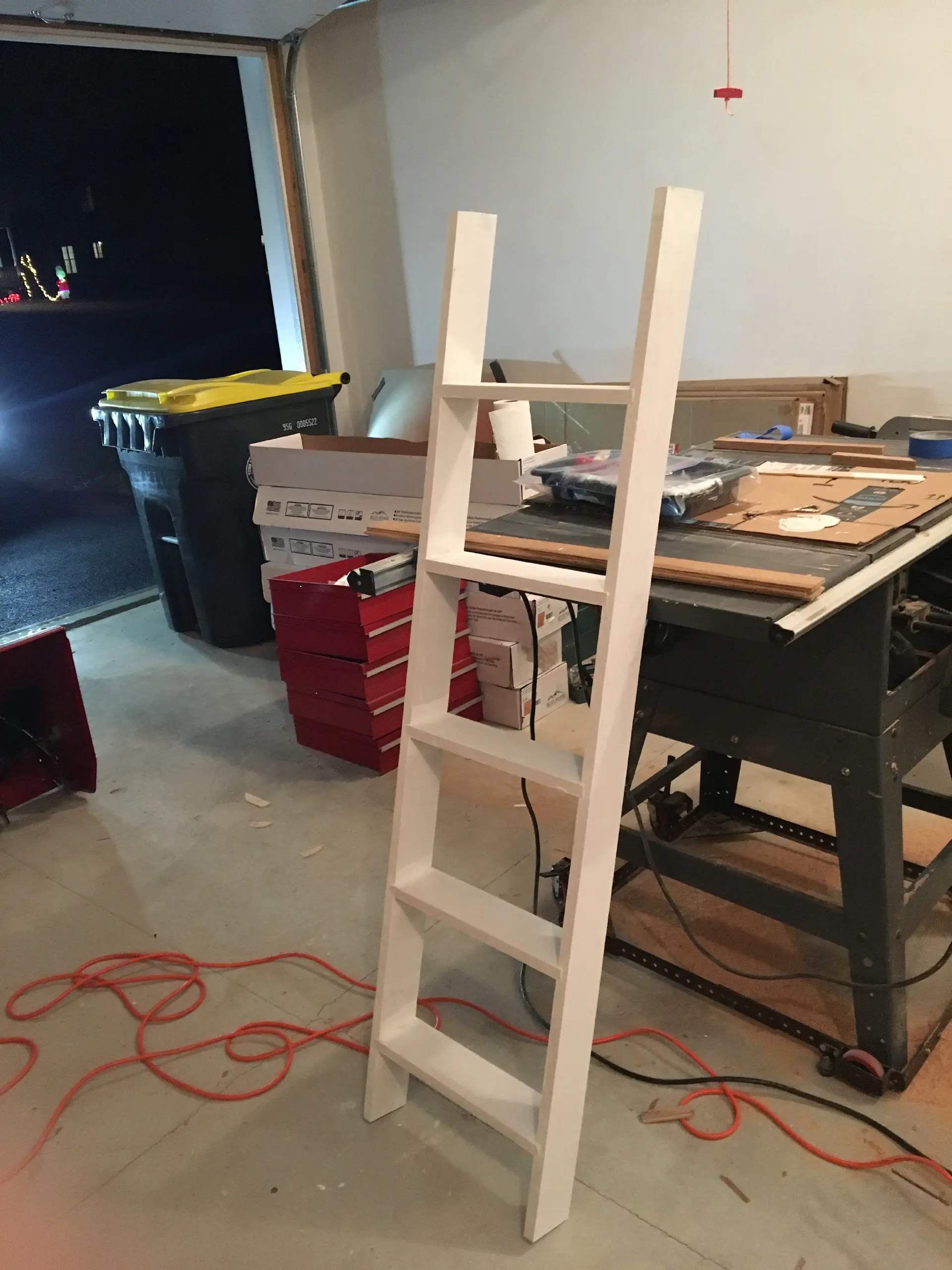 In our house, we have this little shelf almost 8 feet long and 3 feet wide. Rather than put up decorations, we decided to buy a cushion and make it a little sitting nook. Unfortunately, it is also almost five feet up and completely inaccessible. I couldn't find any strong, stable ladder to put there, so I built this out of oak. It's secured at the top with two metal L brackets that I bent to match the tilt of the ladder and the rungs are dadoed into the legs. Also, aren't those little gnomes just the best?