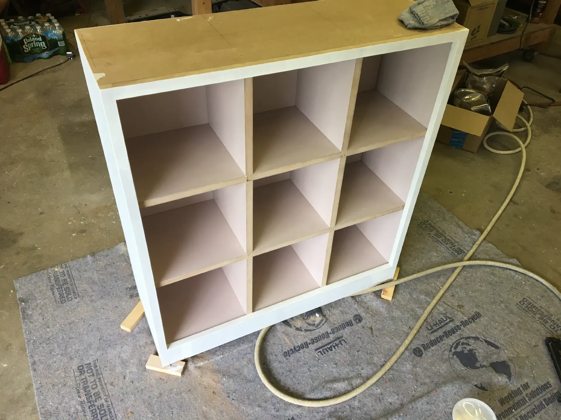 Glueing the two cabinets up was incredibly painful. The number of pieces that had to come together made this much harder than a simple set of shelves. Between Gina, Gina's dad, and myself, we were still racing the clock trying to get glue on everything and assemble them. MDF loves to soak up glue. To make things more difficult, I had accidentally miscut all the middle pieces by an 1/8 of an inch, so when we tried putting on the back, it didn't sit flush to all of the pieces. In the end, to get rid of the bow in the back, I belt sanded down a lot of the MDF. If I did it again, I'm sure it would've come out better, but overall it was a tough glue up.