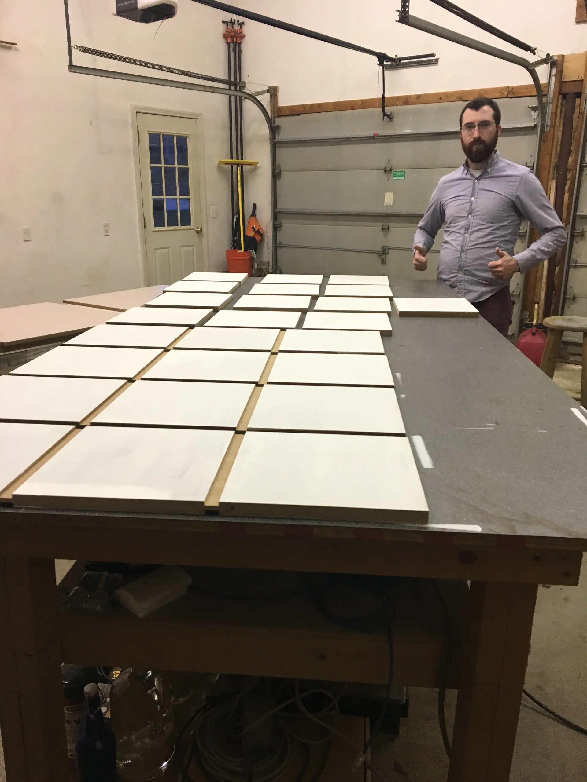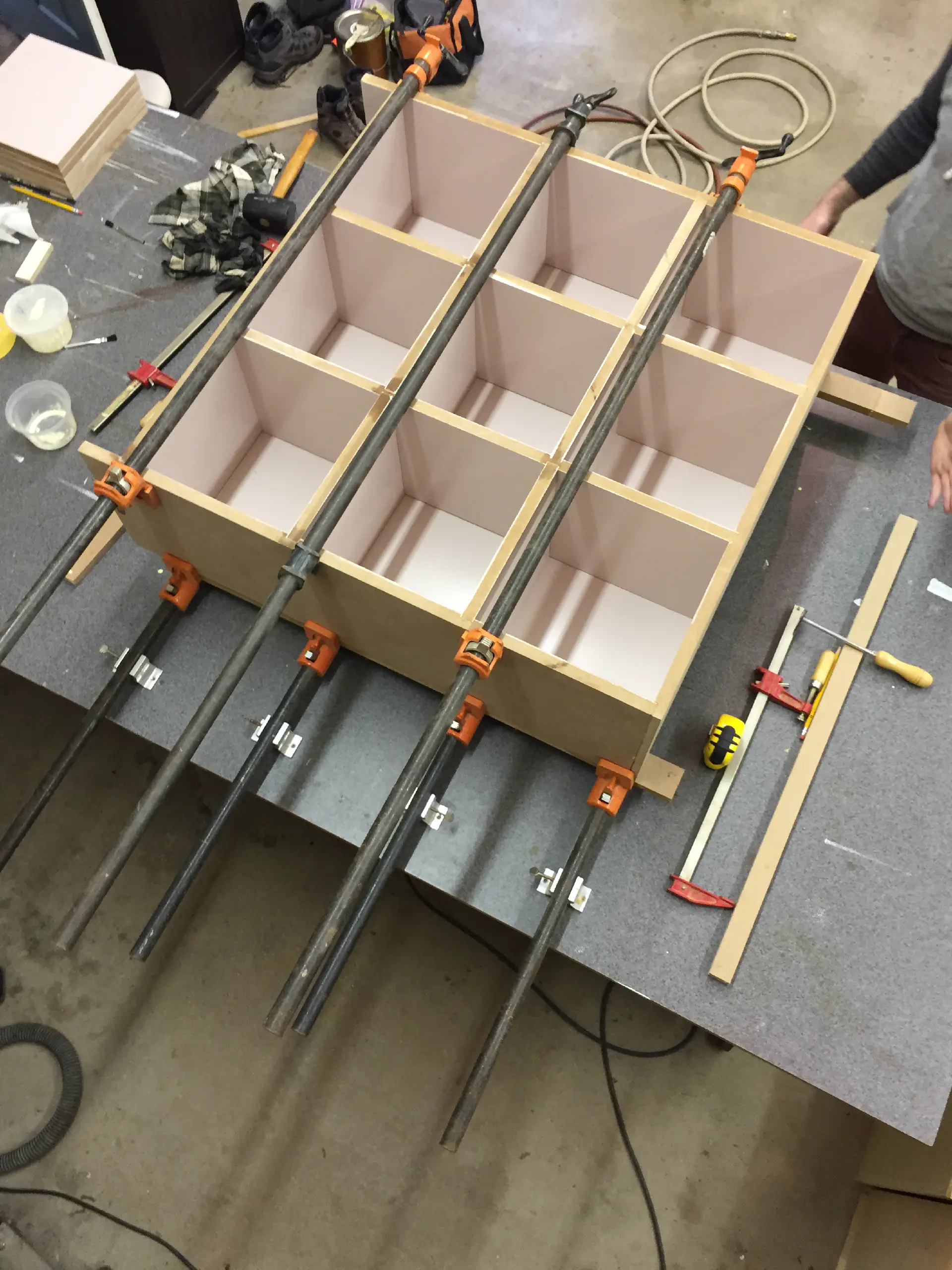 When adding the face frame, we had to use every clamp we had access to. The frame was placed on top of the existing MDF and butt jointed at the corners. Doing this again, I'd probably half-lap those pieces so they sit flush and hold eachother on with more glue surface between them, but this worked well enough. We were able to use scraps from the cabinets for the face frame.