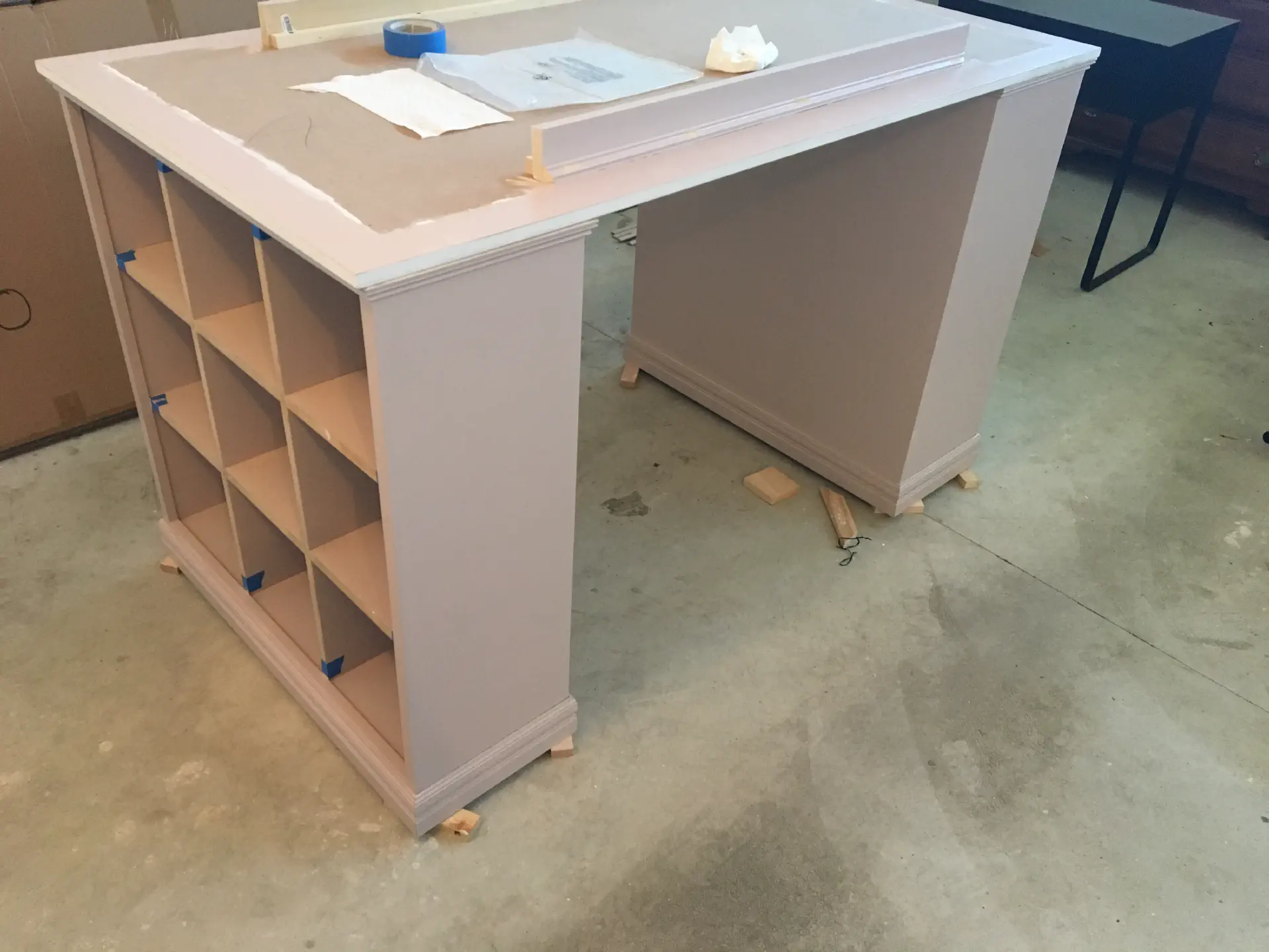 All of the work up till now was at Gina's parents house. When we got it to our garage, we painted the sides of the cabinets and top and bottom of the desk top. Every surface had at least one coat of primer and two coats of paint. The desk top had two coats of primer with heavy sanding after them to get the smoothest possible surface and finished with three coats of paint.