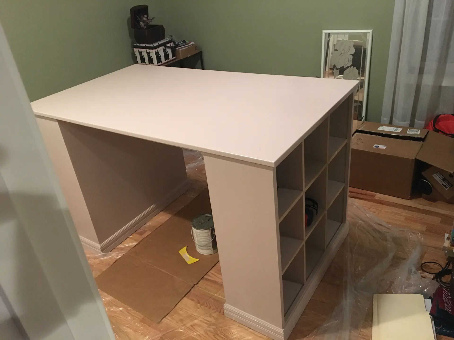 Gina was looking for a new desk since her IKEA corner desk had traveled between at least four different homes and was falling apart, so we decided to build one. I had never done any woodworking before, but was excited to try it out. She was looking for a taller desk, around counter height, so she could stand and work comfortably, or while sitting on a higher (drafting-like?) chair. We broke down multiple sheets of MDF and dadoed the pieces for necessary fits. Rather than paint after assembly, we painted the inner pieces first to save time and make it altogether easier.