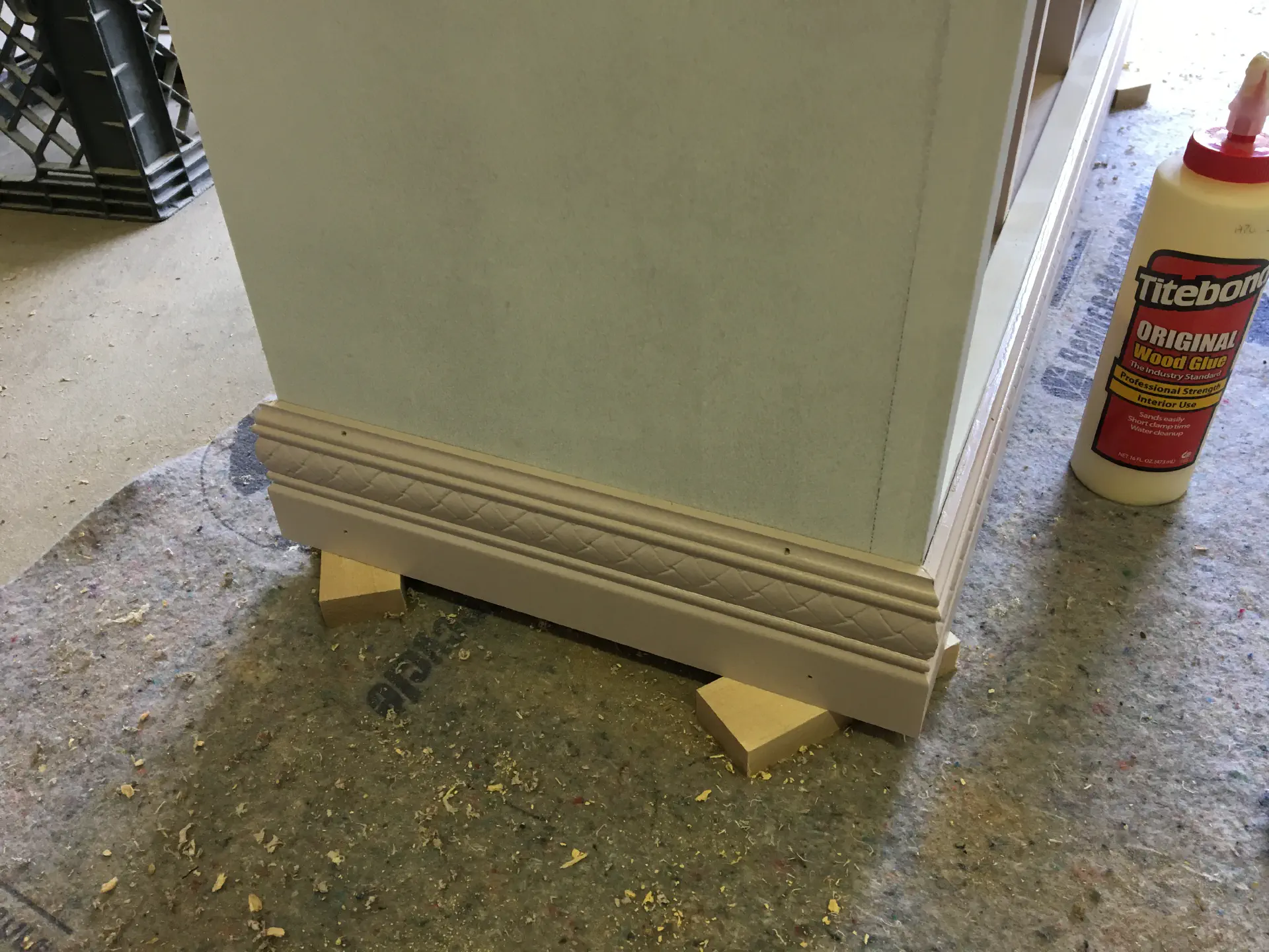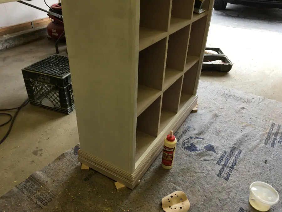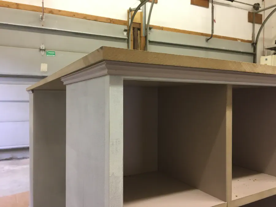 Once we had the face frame on and primed, we added the trim. I prepainted this as well with two coats so after assembly I could do a quick coat to hide any putty to fill in nail holes. Rather than a simple, ordinary baseboard molding, we went for one with a design. It was harder to paint quickly, but gives it a unique look. For the upper molding, we flipped upside down base cap molding.