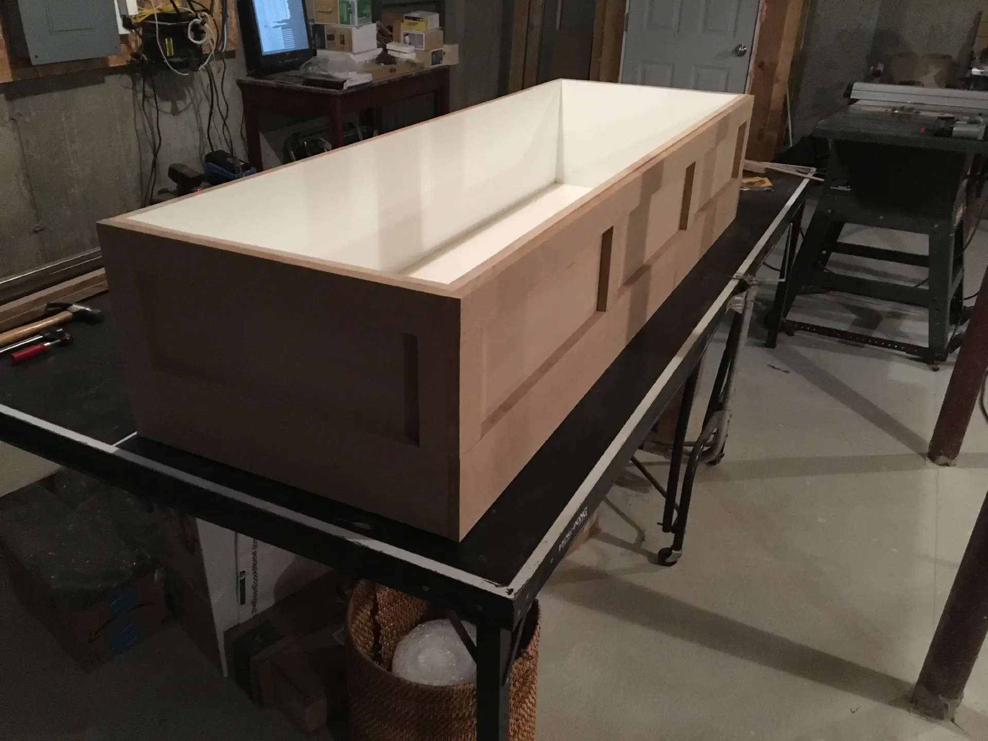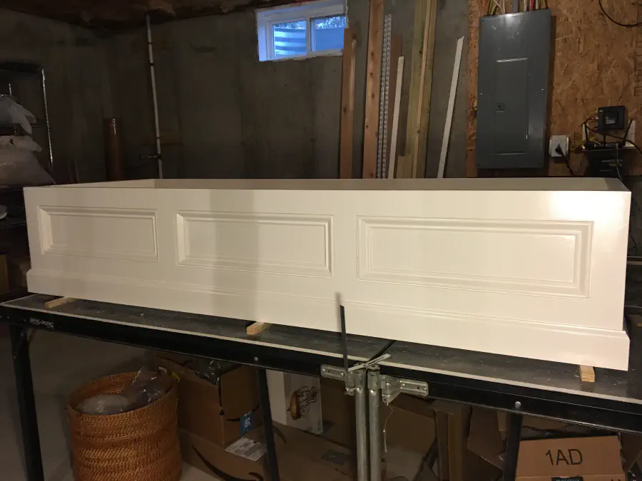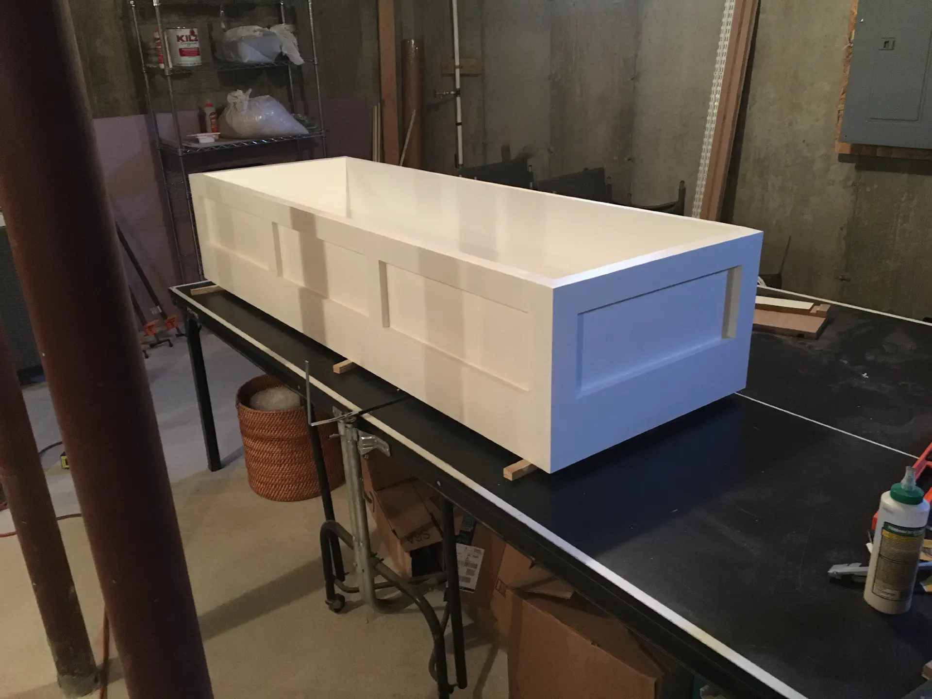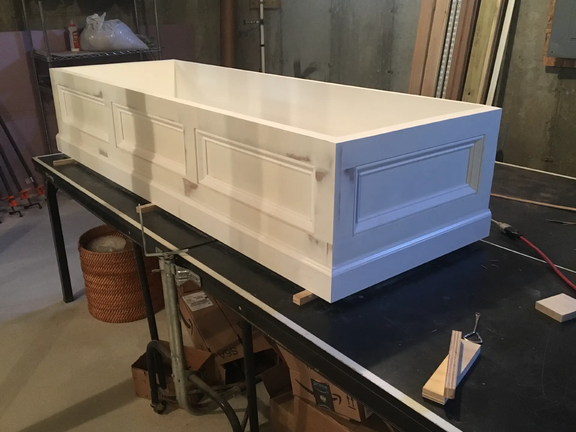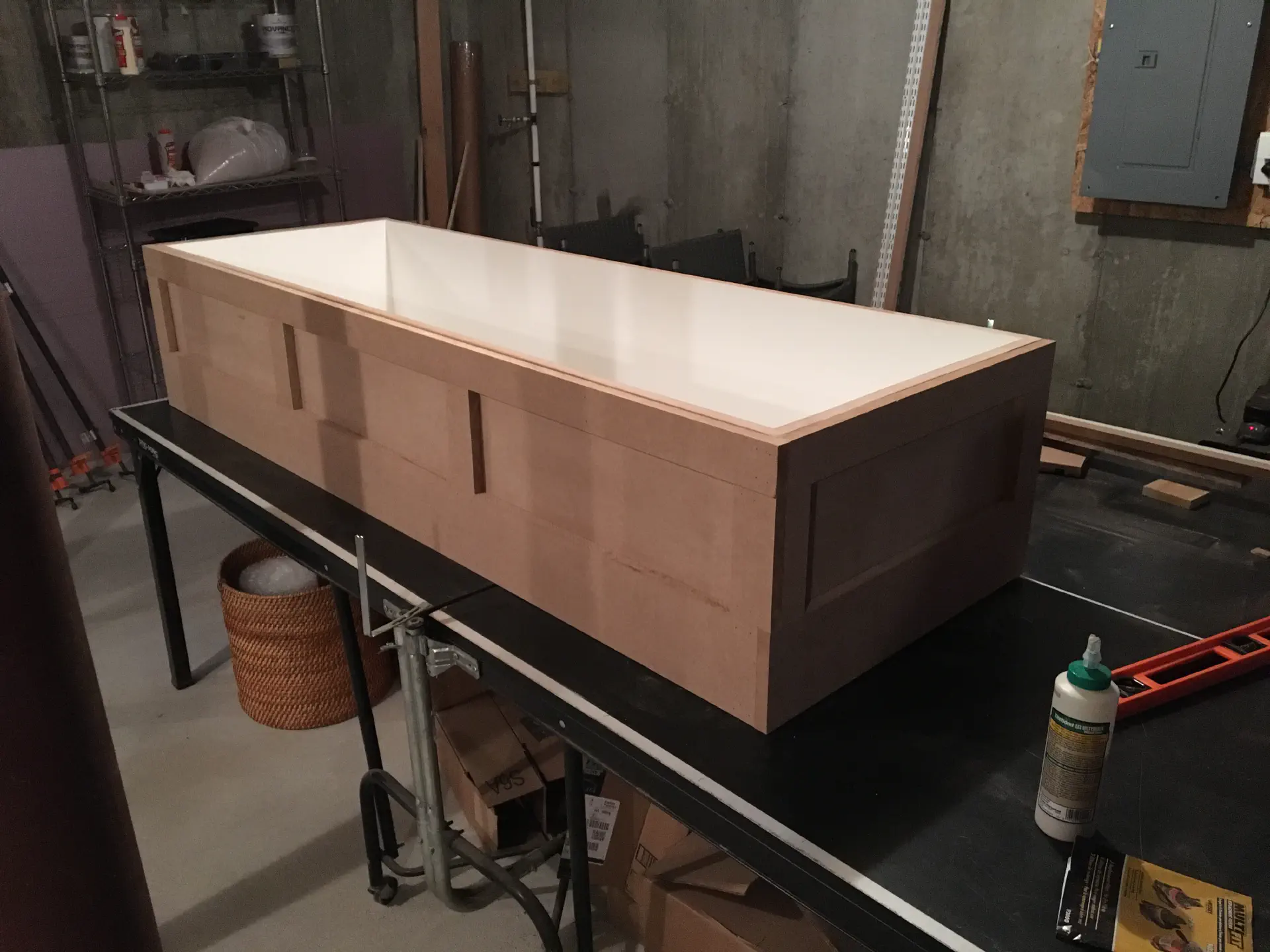 The bench is essentially just a box with a wainscoting on top, similar to what some people have in a dining room. The box is constructed out of MDF for it's smooth, consistent appearance, but after two large and very heavy projects, I think I am done with MDF. I could imagine it for small projects, but the amount of dust it produces, having to use oil-based primer, and just the sheer heaviness of the wood is all pretty frustrating.