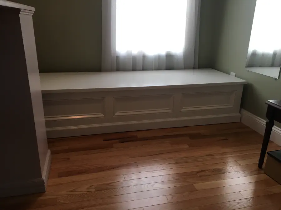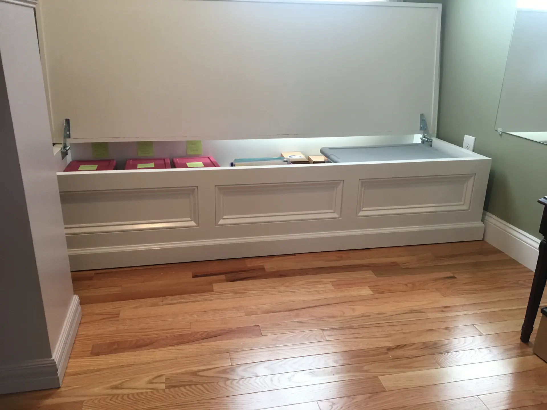 After a very long time, I've finally finished the woodworking aspect of the storage bench in Gina's office. Between the start and end of the project, we worked on a couple small projects, I played a lot of videogames, and we got married. Some of that was procrastination, some of it was just being overwhelmed with other stuff to do. Over the end-of-year holiday I finally felt relaxed and free enough to tackle the remainder of the project.